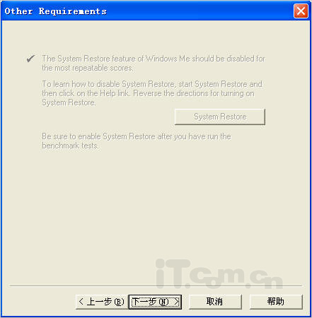 接着这个页面有提示,如果软件运行在Windows Me系统下,要先将ME“系统还原”功能关闭,