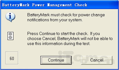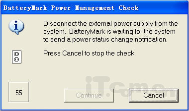 晕倒,又被软件欺骗感情了。这个页面是测试Battery Mark和机器的电源管理程序是否兼容,点Continue开始检测。(由于为了老机型的电源管理兼容,Battery Mark对专用电源管理程序兼容性稍差)
