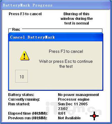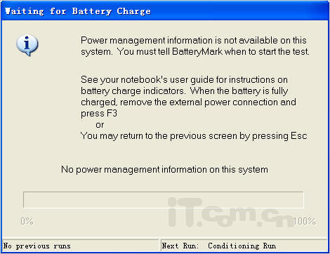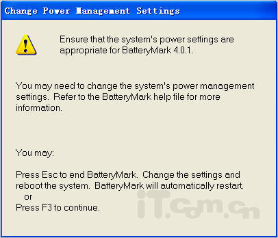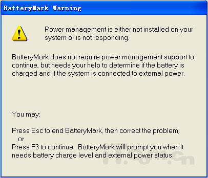 此时会弹出警告,提示Battery Mark将在没有电源管理的情况下运行,按F3继续,按Esc退出。